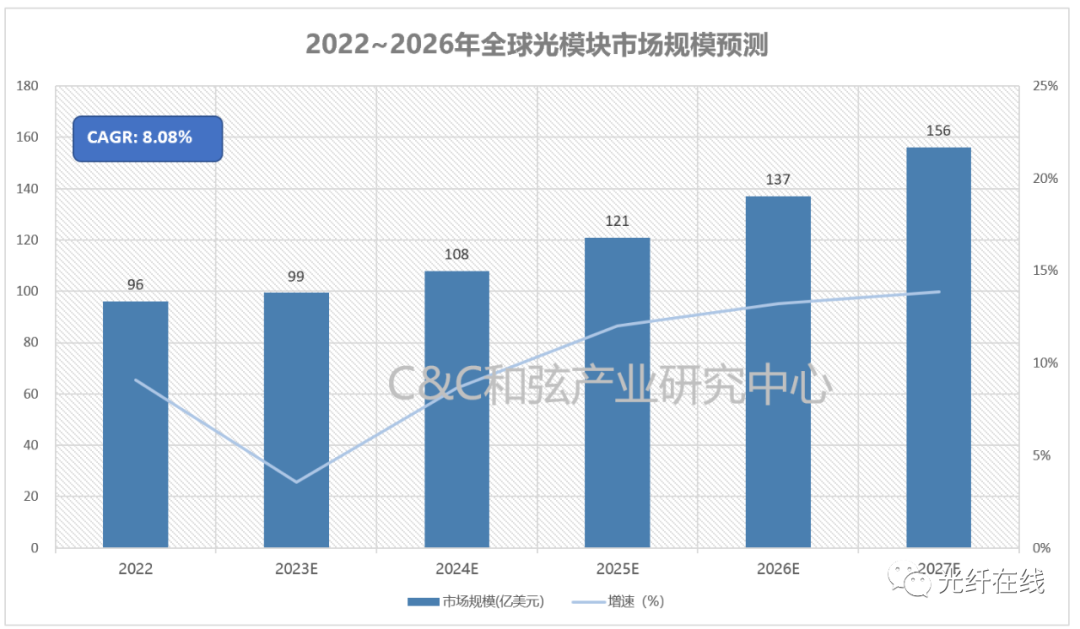 2022年全球光模块市场规模96亿美元,同比增长9%。